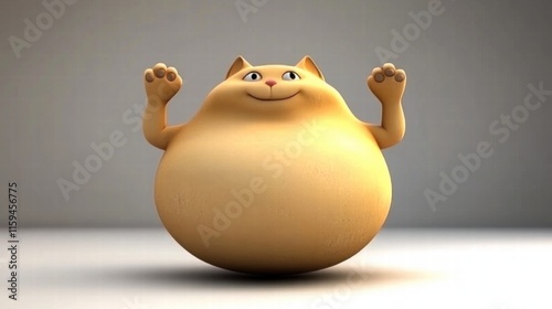 cat, kitten, felino, chubby, fat, overweight, round, fats, yoga, pose, stretching, playful, cute, adorable, funny, cartoon, character, three-dimensional, render, animal, pet, happy, joyful, cheerful, orange, gold, light brown, white, simple, minimalist