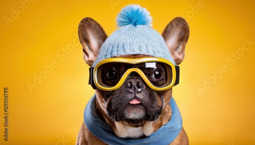 Playful French Bulldog in Ski Attire Against a Bright Yellow Background, Sparking Joy and Humor Amidst Winter Vibes