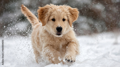 Playful golden retriever puppy enjoys running in fresh white snow during winter outdoor play