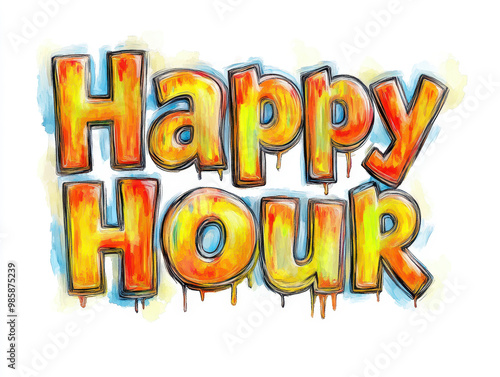 Playful 'Happy Hour' text in bright colours with a dripping effect on a white background.