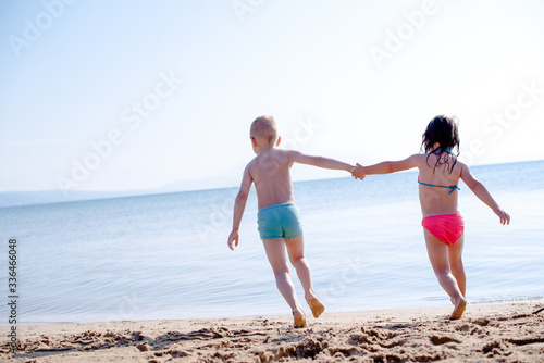Playful holiday, kids are running on a beach
