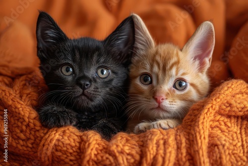 animal, pet, friendship, adorable, cute, furry, photoshoot, orange background, studio, kitten, puppy, dog, cat, companionship, playful, mischievous, contrast, texture, fur, whisker, paw, curiosity, innocence, portrait, vibrant, colourful, lighting, composition