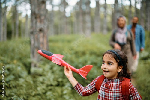 Playful Muslim girl has fun with toy airplane during family day in nature.