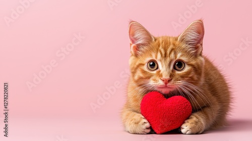Playful orange kitten holding red heart studio animal photography soft pink background adorable concept