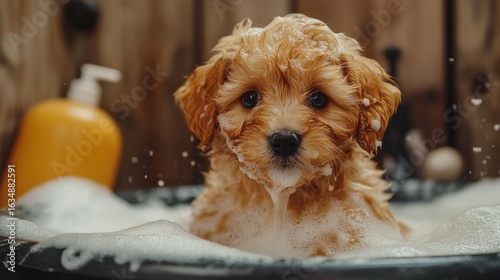 Playful puppy bath time at home cute dog grooming experience cozy environment adorable concept
