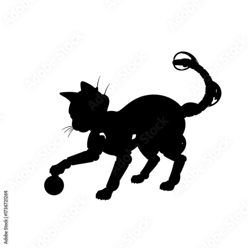 cat, felino, pet, animal, silhouette, black, shadow, playful, playing, game, toy, ball, active, dynamic, movement, modern, graphic, design, minimal, abstract, concept, creative, unique, distinctive, robot, robotic, mechanical, articulated, segmented, cyborg, futuristic, technology, innovation, digital, mascot, logotype, icon, symbol, domestic, kitten, action, energy, sleek, stylish, smart, future, fun, entertainment