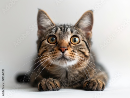 Playful tabby cat posing against a white background
