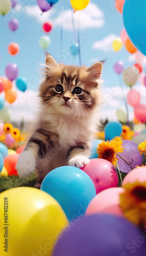 Playful Whimsy: A Kitten Amidst a Field of Colorful Balloons,cat with balloons,cat playing with balloons