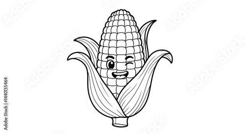 corn, cob, cartoon, character, grain, plant, food, sweet, healthy, cute, funny, winking, playful, yellow, green, children, children, illustration, line art, drawing, outline, activity, educational, fun, creative, art, design, printable, sheet, book, preschool, kindergarten, toddler, simple, black-and-white, graphic, learn, paint