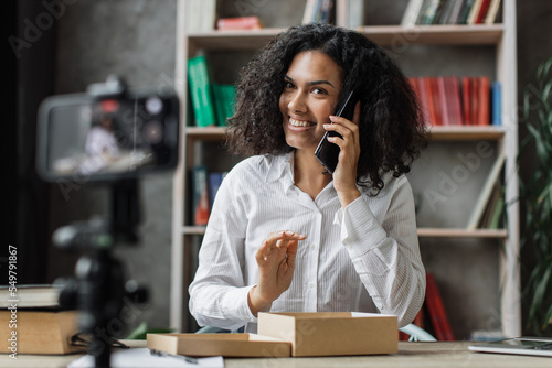 Pleasant multinational woman filming video on modern phone camera while opening parcel box with new smartphone. Concept of people, technology and blogging.