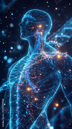 human, body, nervous, system, deoxyribonucleic acid, futuristic, wireframe, plexus, energy, particle, glowing, anatomy, biology, science, medicine, technology, digital, network, connection, innovation, health, wellness, research, exploration, space, dark, abstract, three-dimensional, rendering, illustration, graphic, design, concept, medicals, health care, node