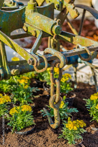 italy, agriculture, crop, flower, metal, plough, dirtied, spring, tool, vintage, yellow