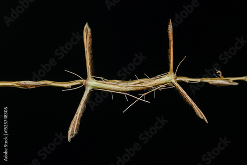 Plume moths mating on a twig with black background