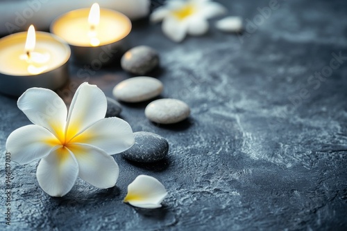Plumeria flower with five petals and stones, there is candle also on grey concrete table in massage bright room, for spa background