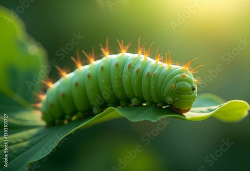 caterpillar, green, fats, leaf, vibrant, nature, insect, macro, closeup, soft light, morning, sunlight, glow, peaceful, garden, wildlife, resting, detail, bright, delicate, forest, foliage, serene, natural, photo, texture, beauty, summer, spring, crawling, environment, tiny, outdoors, fresh, flora, fauna, eco, dew, organic, soft focus, background, calmness, metamorphosis, life cycle, greenery, ecosystem