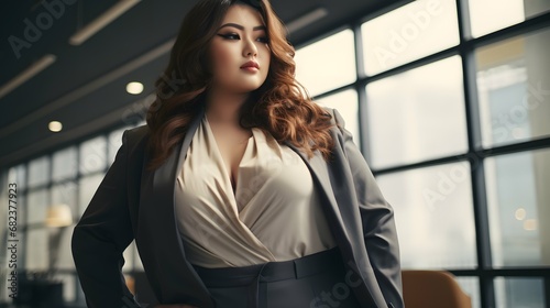 Plus size beautiful business woman model in a suit, in the office, window in the background