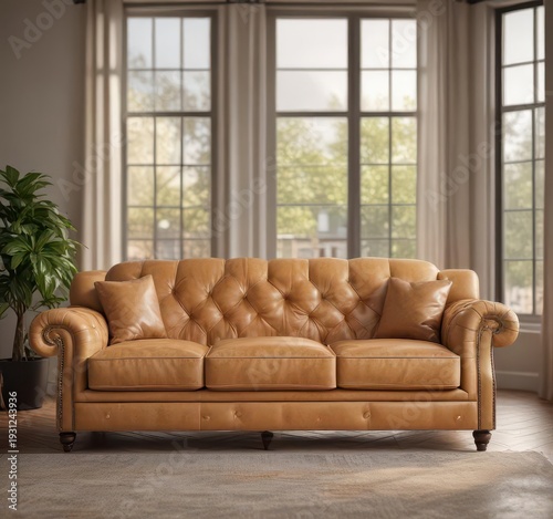 Plush beige leather sofa with tufted cushions and rolled arms sitting in front of large window , window, living room