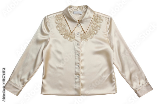 blouse, satin, beige, lace, collar, elegant, shirt, fashion, apparel, clothing, silky, formal, style, clothes rack, buttoned, garment, delicate, feminine, textile, chic, outfit, design, luxury, sartorial, polished, refined, sophisticated, classic