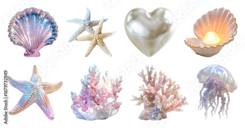 transparent, collection, iridescent, underwater, aesthetic, jellyfish, seashell, treasure, element, isolated, starfish, elegant, glistering, mermaid, animal, marin, photograph, scale, summer, beach, coral, decor, nubes, mixed, ocean, pearl, shell, sea, set, oceanic