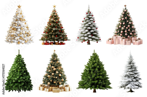 christmas tree, snow-covered, transparent, collection, decoration, ornamented, celebrate, christmas, branch, colourful, isolated, present, element, festive, holiday, photograph, winter, green, mixed, white, gold, pink, tree, red, set, celebration