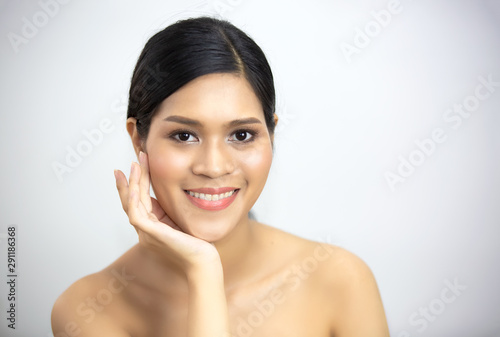 PoBeautiful Young Woman with Clean Fresh Skin touch own face . Facial treatment. Cosmetology , beauty and spa against white backgrourtrait Of Shirtless Woman with clear skin care Over white Background