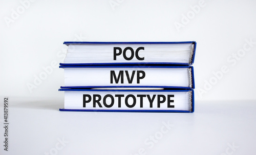 POC, MVP or prototype symbol. Books with words POC, proof of concept, MVP, minimum viable product and prototype. Beautiful white background. Business and POC, MVP or prototype concept, copy space.