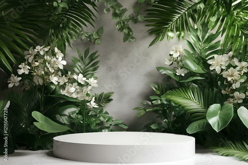 Podium background product green nature 3D forest stand white plant. Tropic flowers