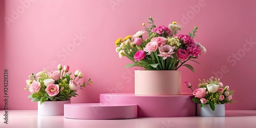 Podium with flowers for showcasing products on a pink showcase mockup , Podium, flowers, demonstrating, products