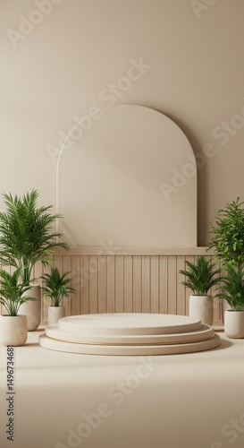 dais, plant, beige, room, interior, design, arch, pot, minimalist, display, presentation, image, show, surrounded, feature, wall, with, light, wooden, panel, recess, natural, realistic, texture, subtile, shadow, camera, angle, wide, shot, capturing, entire