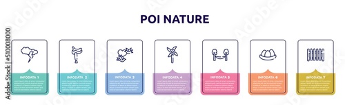 poi nature concept infographic design template. included cloud and lightnings, horse saddle, birds couple, pinwheel, hammock, egg in a nest, garden fence icons and 7 option or steps.