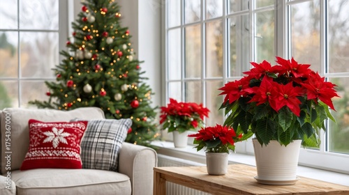 Poinsettia plants decorating cozy christmas living room