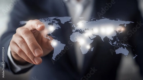 hand, pointing, world map, city, glowing, businessman, suit, finger, global, worldwide, international, connecting, connection, network, digital, technology, concept, business, corporate, future, innovation, modern, leadership, success, planning, strategy, diagram, datum, location, communication, finance, trade, growth, marketing, economy, investment, opportunity, market