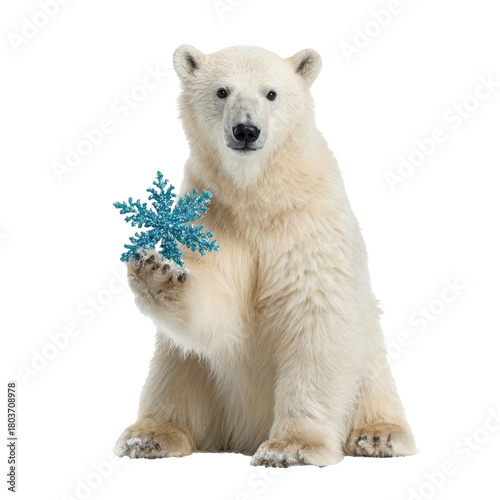 Polar bear holding a snowflake decoration.