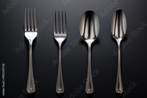Polished stainless steel cutlery including forks and spoons arranged symmetrically