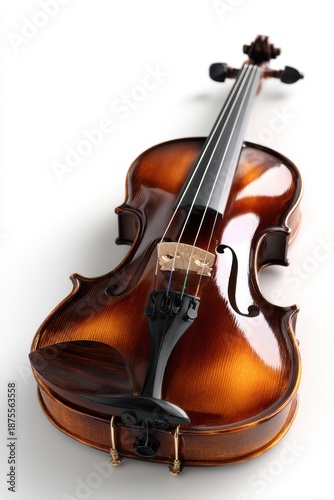 Polished wooden violin displayed on a white seamless background with soft studio lighting