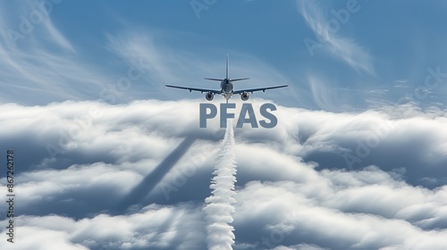 Polluted air aircraft emissions contaminating sky with PFAS chemicals amidst clouds, healthy risk concept, banner