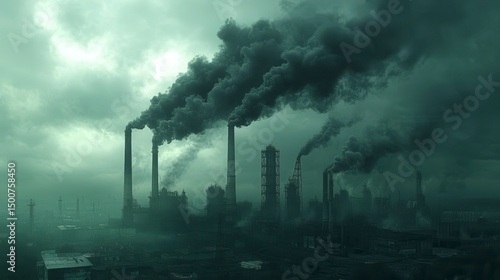 Polluted industrial landscape with smokestacks emitting dense plumes under an overcast sky