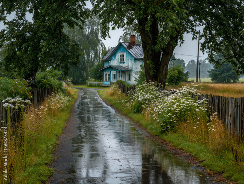 Polna droga po deszczu prowadząca do niebieskiego domu wśród zielonych drzew i kwitnących łąk. Sielski, wiejski krajobraz w deszczowy dzień.