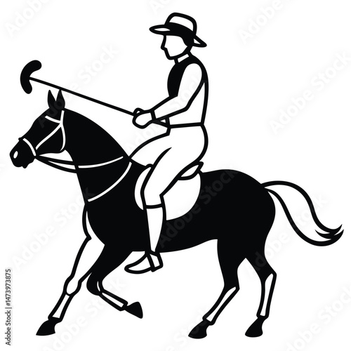 polo, player, horseback, riding, horse, mallet, ball, sport, equestrian, illustration, black, white, silhouette, vector, graphic, design, clip art, icon, symbol, monochrome, simple, elegant, classic, vintage, retro, stylish, athlete, competition, game, tournament, rider, equine, mammal, animal, sportsman, action, movement, dynamic, speed, energy, powerful, strong, skill, precision, sharpened, concentration, hat, clothing, uniform