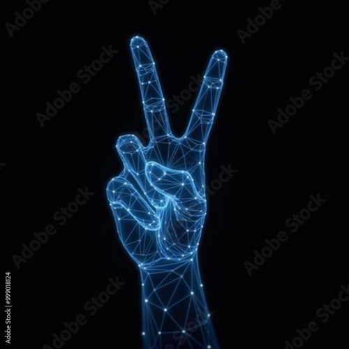 Polygonal blue hologram of hand giving v sign on dark background.