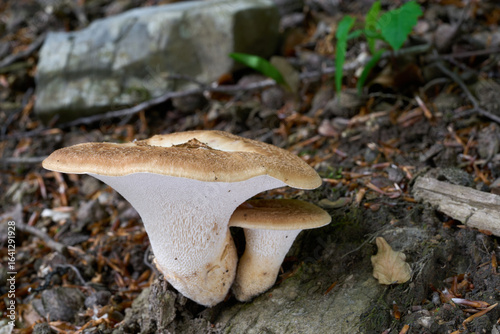Polyporus tuberaster mushroom on the beech. Known as tuberous polypore. Two edible mushrooms in the beech forest.
