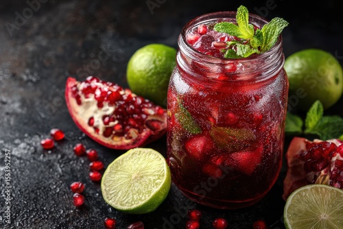 Pomegranate mojito with pear juice in a jar seen from above
