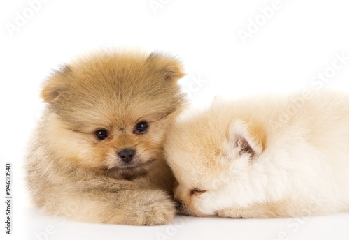 pomeranian, puppy, white, background, tan, cream, light, brown, juvenile, young, adorable, cute, 2, resting, sleeping, furry, tame, companion, curious, together, trust