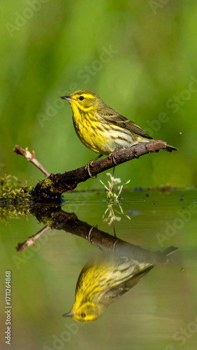 warbler, yellow, water, duck pond, swamp, lake, animal, outdoors, summer, spring, green, nature, bird, wildlife, tree branch, wild, garden, beak, feather, tree, bird, small, avian, feather, pretty, cute, songbird, migration, migrating, log, perched, perch, breast, wing
