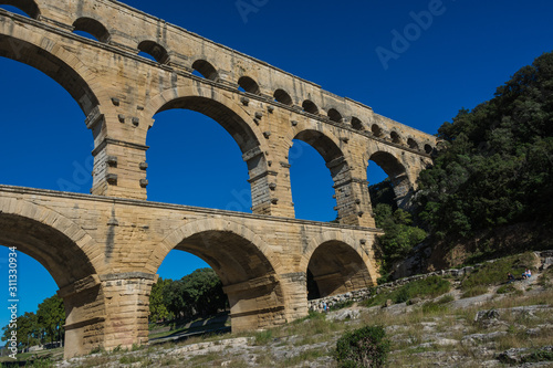 aqueduct, roman, landmark, ancient, architecture, bridge, arch, france, stone, europa, gard, pont, old, travel, historical building, history, arena, arch, provence, sky, blue