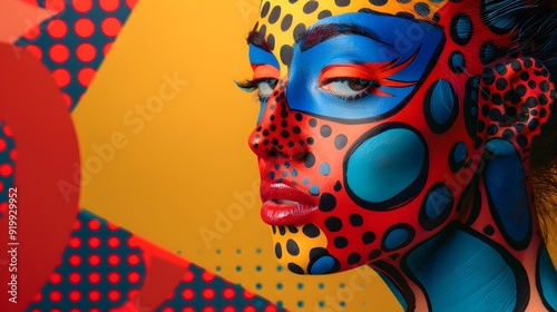 Pop art-inspired portrait of a woman with bold primary color face paint and dotted patterns against a vibrant background