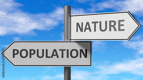 Population and nature as a choice - pictured as words Population, nature on road signs to show that when a person makes decision he can choose either Population or nature as an option, 3d illustration