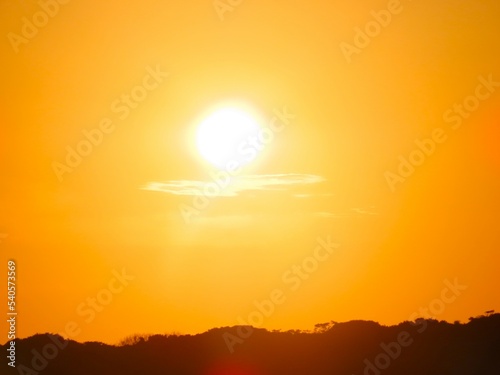 Por do sol com céu alaranjado em uma tarde de verão na Barra do Una, Peruíbe, São Paulo
