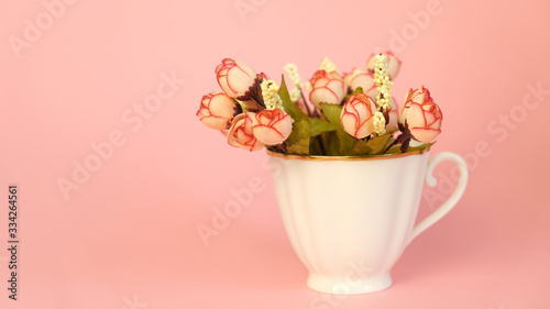 Porcelain cup full of flowers on pink background. Copy space, banner. Spring cozy home. Good morning concept.