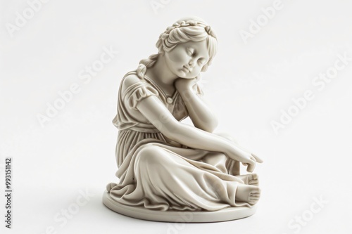 Porcelain figurine of a young girl sitting and resting her head on her hand, appearing thoughtful on a white background